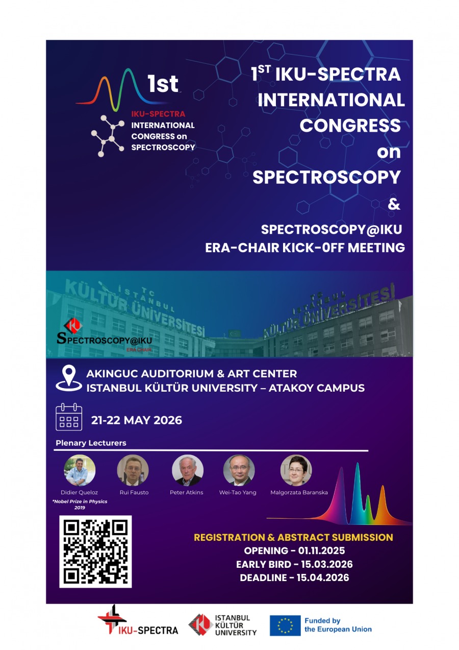 Spectroscopy@IKU ERA-Chair Projesi kapsamında organize edilen bu birleşik etkinlik, spektroskopi ve moleküler bilimler alanlarında çalışan seçkin bilim insanlarını, genç araştırmacıları ve sanayi temsilcilerini bir araya getirecektir. Kongrede, Nobel Ödülü sahibi Prof. Didier Queloz, Spectroscopy@IKU ERA-Chair Holder Prof. Rui Fausto, Prof. Peter Atkins, Prof. Wei-Tao Yang ve Prof. Malgorzata Baranska davetli konuşmacı olarak yer alacaktır.