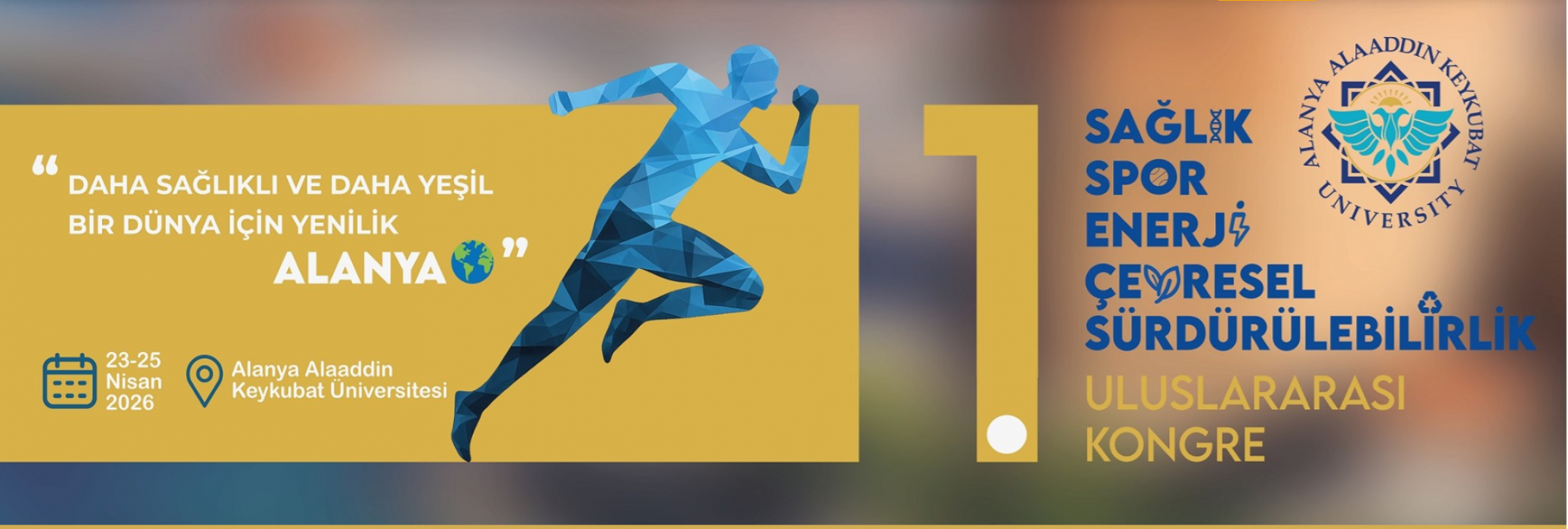Alanya Alaaddin Keykubat Üniversitesi tarafından sağlık bilimleri, spor bilimleri, enerji ve çevresel sürdürülebilirlik ile insan çevresinde sürdürülebilir kalkınma ile ilgili çeşitli bilimsel disiplinleri bir araya getirmek amacıyla, 23-25 Nisan 2026 tarihleri arasında Alanya'da “1. Uluslararası Sağlık, Spor, Enerji ve Çevresel Sürdürülebilirlik Kongresi" düzenlenecektir.
