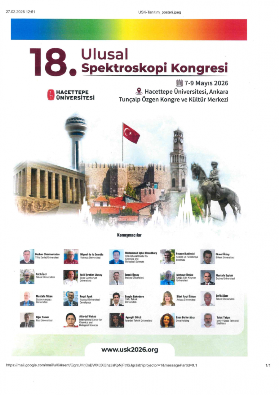 Hacettepe Üniversitesi Fen Fakültesi Kimya Bölümü Öğretim Üyesi Prof. Dr. Bekir SALİH'in başkanlığında, Beytepe Yerleşkesi Tunçalp Özgen Kongre ve Kültür Merkezi’nde 07-09 Mayıs 2026 tarihleri arasında “18. Ulusal Spektroskopi Kongresi” düzenlenecektir.