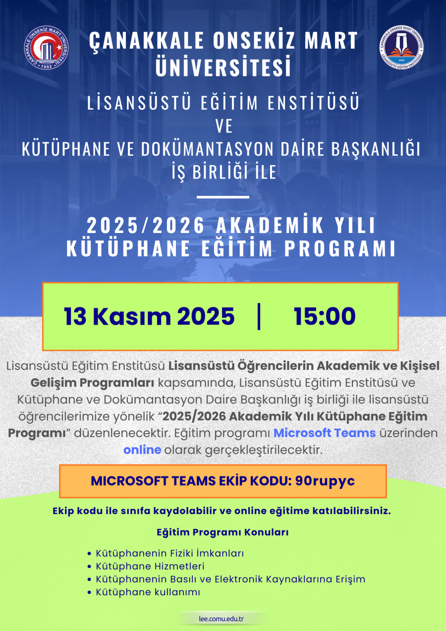 13.11.2025 tarihinde saat 15.00’te Lisansüstü Eğitim Enstitüsü Lisansüstü Öğrencilerin Akademik ve Kişisel Gelişim Programları kapsamında, Lisansüstü Eğitim Enstitüsü ve Kütüphane ve Dokümantasyon Daire Başkanlığı iş birliği ile lisansüstü öğrencilerimize yönelik “2025/2026 Akademik Yılı Kütüphane Eğitim Programı” düzenlenecektir.