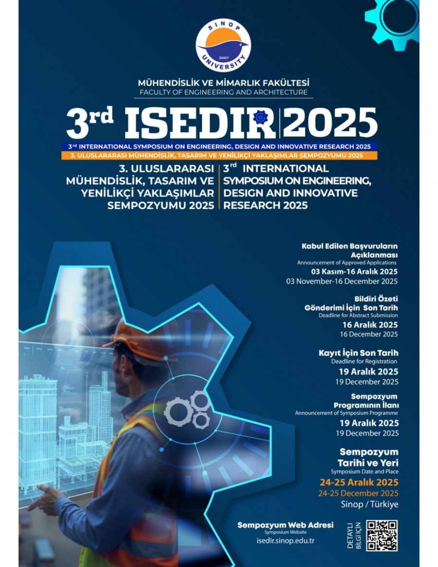 Sinop Üniversitesi Mühendislik ve Mimarlık Fakültesi tarafından 24-25 Aralık 2025 tarihleri arasında “3rd International Symposium on Engineering Design and Innovative Research (ISEDIR-2025)” (3. Uluslararası Mühendislik Tasarım ve Yenilikçi Yaklaşımlar Sempozyumu) düzenlenecektir. Sempozyum hakkında detaylı bilgiye https://isedir.sinop.edu.tr/ adresinden erişebilirsiniz.
