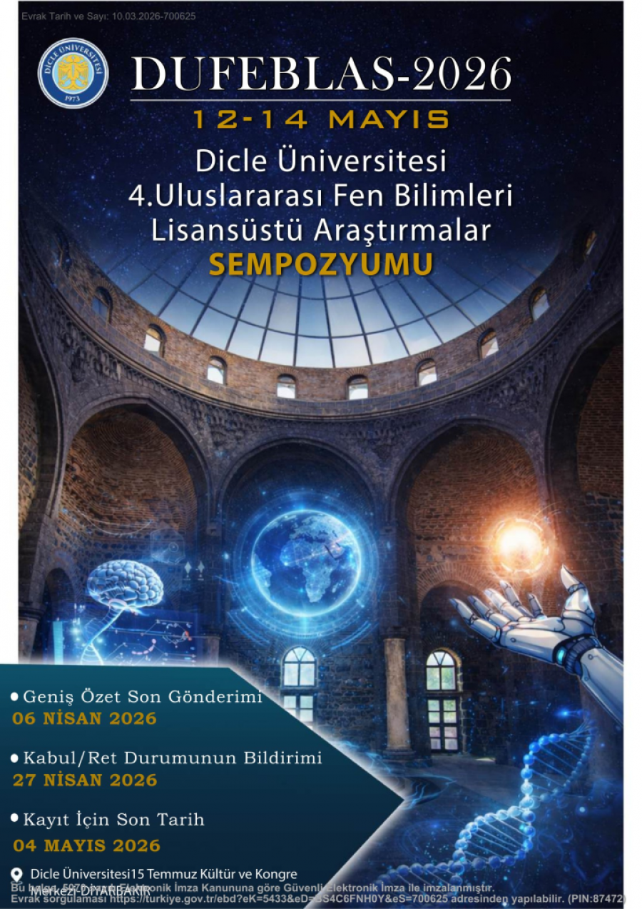 Dicle Üniversitesi tarafından 12–14 Mayıs 2026 tarihleri arasında Diyarbakır'da “Dicle Üniversitesi 4. Uluslararası Fen Bilimleri Lisansüstü Araştırmalar Sempozyumu (DUFEBLAS-2026)” gerçekleştirilecektir.
