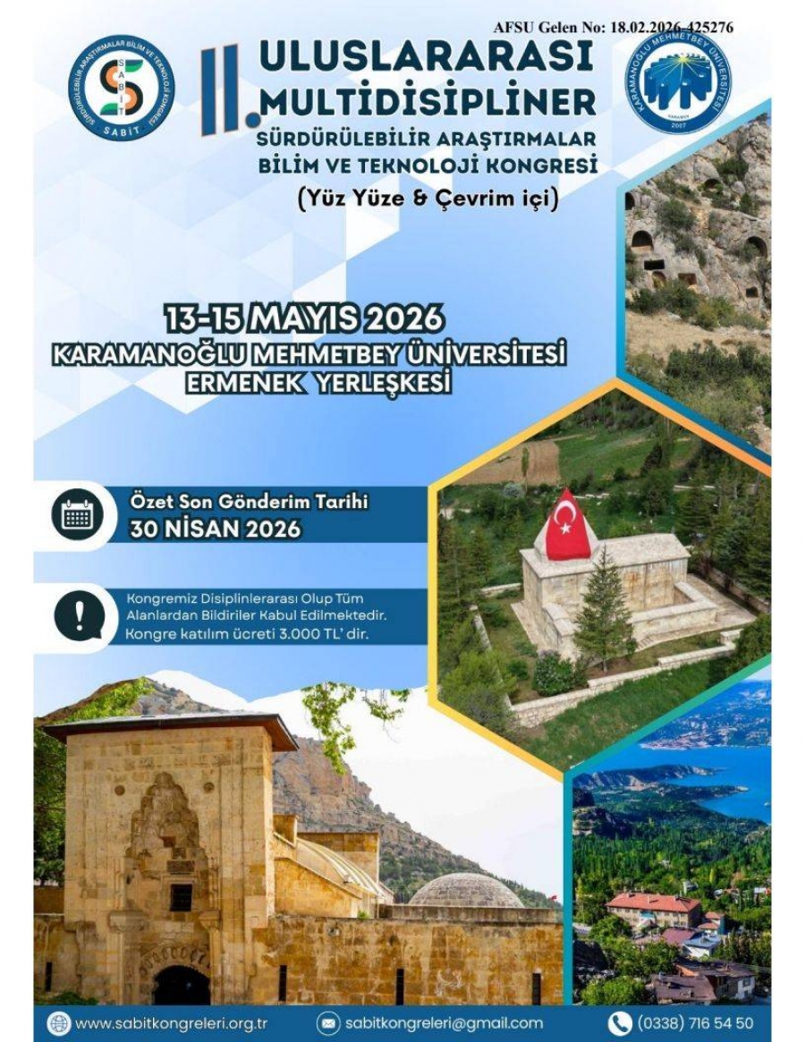 Karamanoğlu Mehmetbey Üniversitesi Ermenek Meslek Yüksekokulu ev sahipliğinde, 13–15 Mayıs 2026 tarihleri arasında, yüz yüze ve çevrim içi (hibrit) olarak “II. Uluslararası Multidisipliner Sürdürülebilir Araştırmalar Bilim ve Teknoloji Ermenek Kongresi” düzenlenecektir.