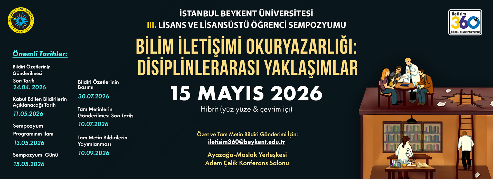 İstanbul Beykent Üniversitesi İletişim Fakültesi ev sahipliğinde, 15 Mayıs 2026 tarihinde “III. Lisans ve Lisansüstü Öğrenci Sempozyumu” gerçekleştirilecektir. “Bilim İletişimi Okuryazarlığı: Disiplinlerarası Yaklaşımlar” temasıyla gerçekleştirilecek sempozyuma yüz yüze ve çevrim içi katılım mümkündür.