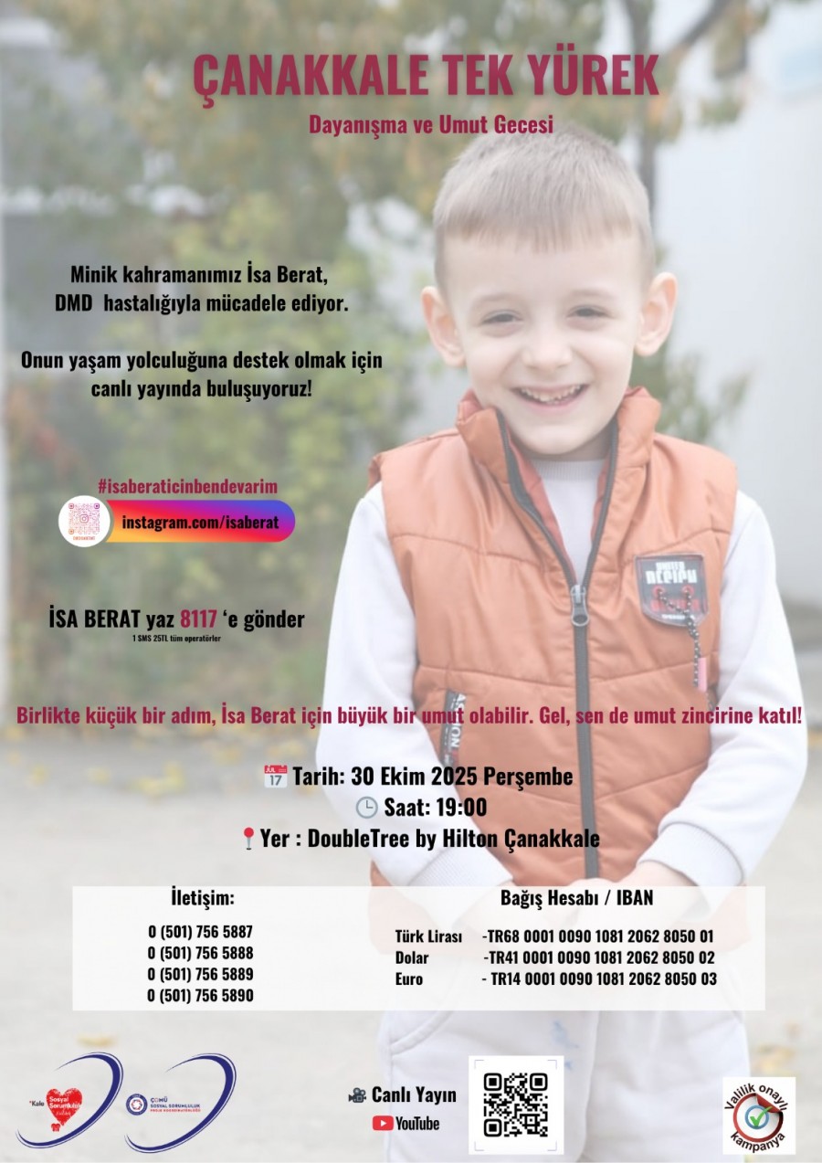 Etkinliği Kaleseramik Sosyal Sorumluluk Kulübü, Çanakkale Onsekiz Mart Üniversitesi Sosyal Sorumluluk Proje Koordinatörlüğü ve Çanakkale TV iş birliği ile 30 Ekim 2025 Perşembe günü saat 19.00’da DoubleTree by Hilton Çanakkale Konferans Salonu’nda “İsa Berat için Yardım Gecesi” etkinliği düzenlenecektir.